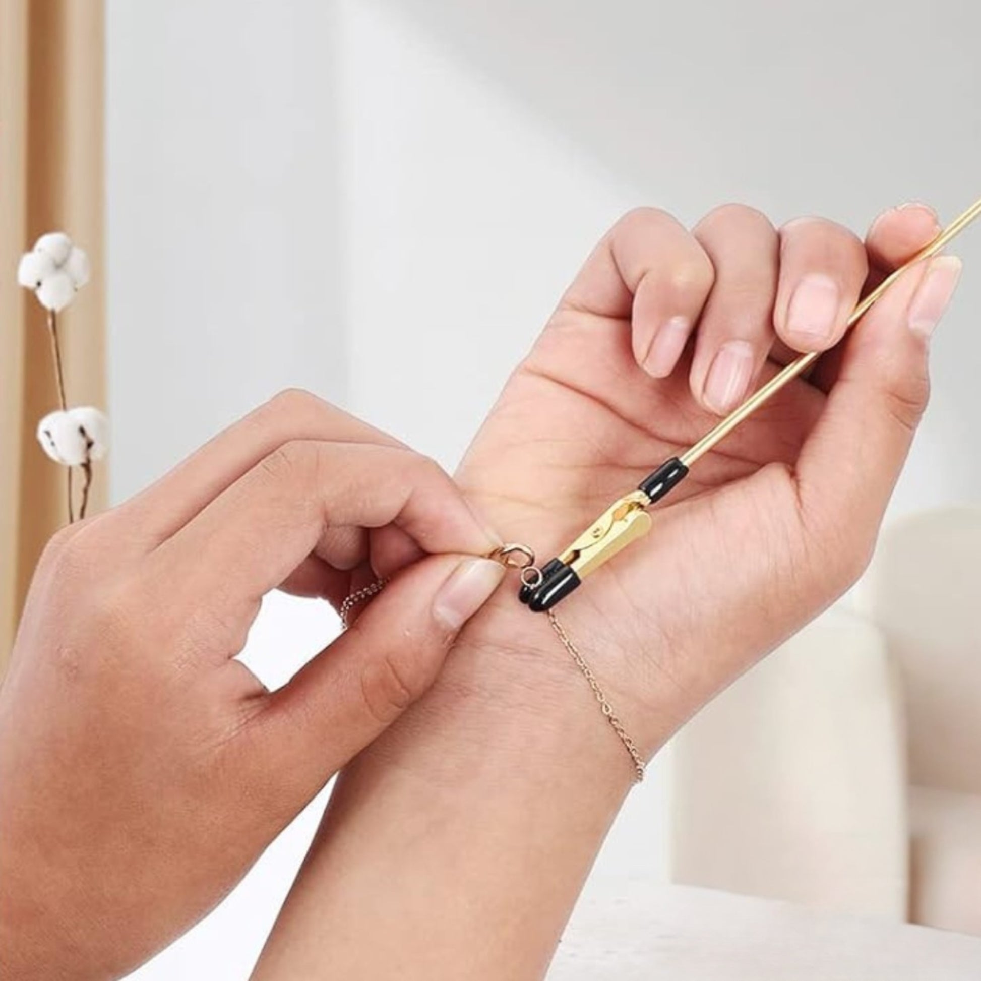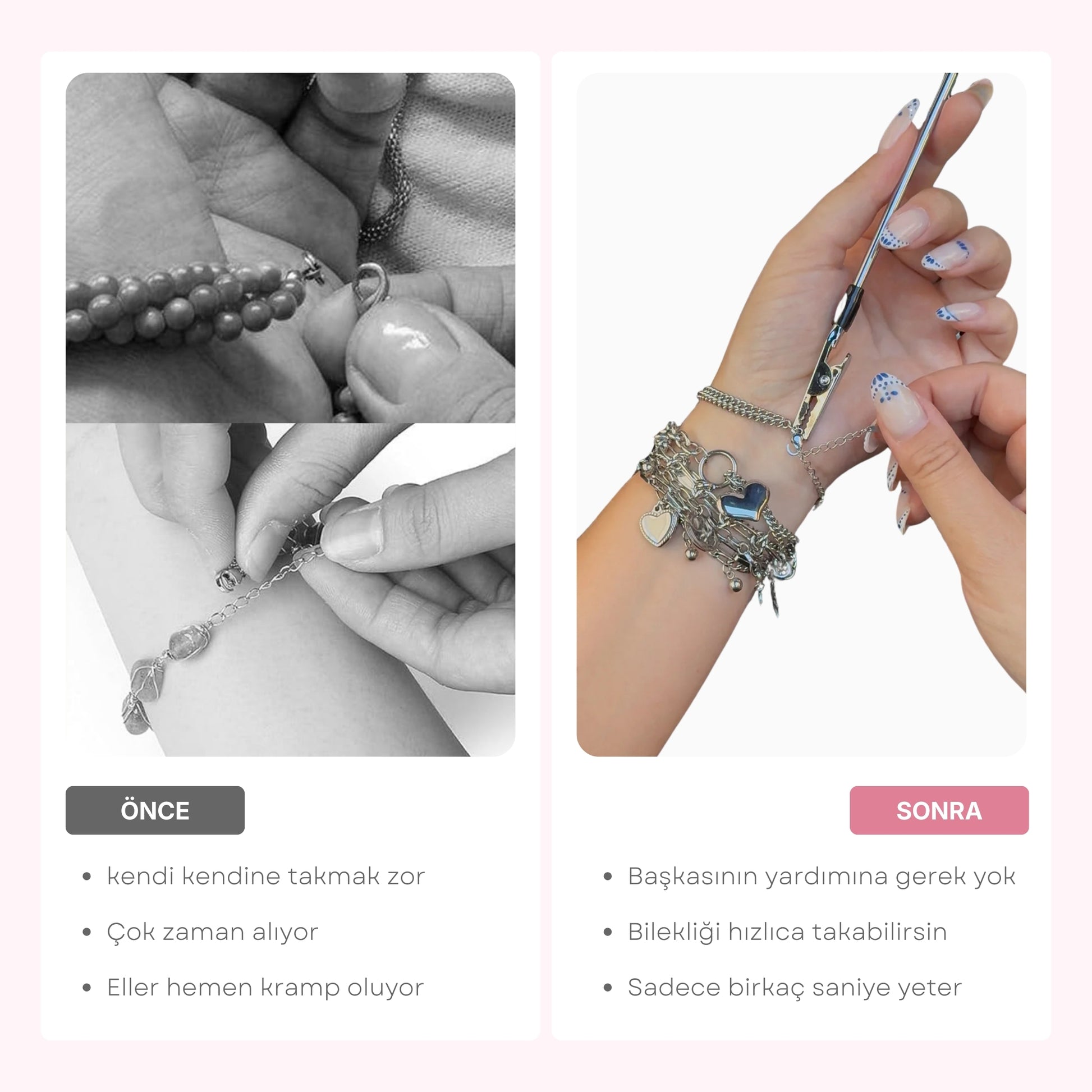 Takılarınızı hızlı ve kolay takabilmeniz için özel tasarlandı. Bilezik, kolye, küpe ve piercinglerde rahatça kullanabilirsiniz. Uzun tırnaklarınız varsa ya da sadece her şeyi kendiniz yapmak istiyorsanız harika bir yardımcıdır.